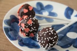 Nadat de taart is afgekoeld snij je de randen eraf en de bovenkant en onderkant. Alles verkruimelen. Blijf suikermelk toevoegen, totdat je een deeg heb, waar je ballen mee kan draaien. Scheurt je deeg tijdens het draaien, dan een eetlepel suikermelk per keer toevoegen, totdat de bal lekker blijft plakken, hij mag niet scheuren (anders valt hij van je lolliestok).