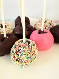 Draai ballen en steek het lolliestokje in het balletje. Plaats de lollie’s op een bord voorzien van bakpapier of prik ze in een stuk piepschuim of foam. Half uur in de vriezer. Chocola smelten en in een smal glas doen, zodat je kan dippen. Dip de lollie’s in de gesmolten chocola. Even wachten voordat je de hagelslag aanbrengt (anders verdwijnt je hagelslag in de nog te zachte chocola). Laat de lollie’s in een stuk piepschuim goed drogen. Zorg ervoor dat de lollie’s recht staan.